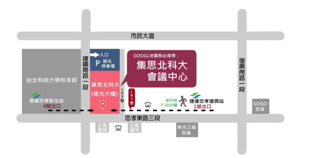 ► 活動地點:集思北科大會議中心 2樓 / 台北市大安區忠孝東路三段1號億光大樓2樓(197號旁,非台北科大校內,見下方交通指引)